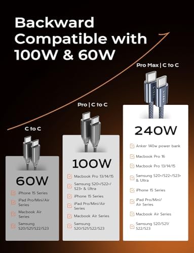![240W USB C to USB C Cable, USBC to USBC [6.6ft/2 Pack] Type C Fast Charging Cable Cord for MacBook Pro, iPhone15/15Pro/15Plus/15ProMax, iPad Pro 2020, Samsung Galaxy S24 Ultra, Compatible 100W/60W](https://m.media-amazon.com/images/I/51VQv0LHOOL._AC_.jpg)