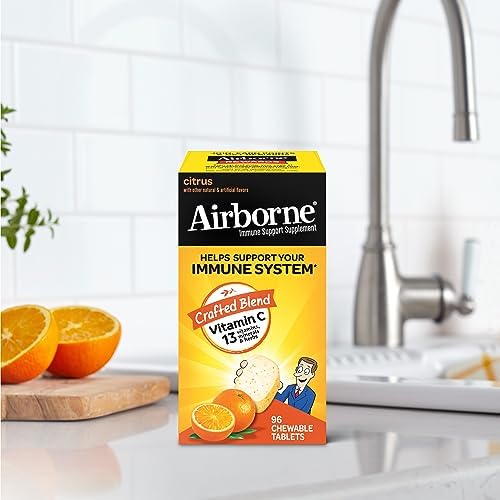 Airborne 1000mg Chewable Tablets with Zinc, Immune Support Supplement with Powerful Antioxidants Vitamins A C & E – 96 Tablets, Citrus Flavor