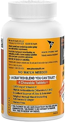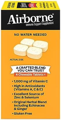 Airborne Chewable Tablets provide immune support* in great-tasting flavors and an easy-to-take form; no water needed. Each serving of (4) tablets delivers a blast of 1000 mg of Vitamin C and 13 vitamins, minerals, & herbs (including Vitamins A & E, Zinc, Selenium, Manganese & Magnesium. Also contains a proprietary herbal blend with Echinacea & Ginger). Developed by a former school teacher, Airborne products are a specially crafted blend of vitamins, minerals & herbs designed to help support your immune system.* Airborne is the #1 Immune Support Gummy, Effervescent and Chewable Brand‡ *These statements have not been evaluated by the Food and Drug Administration. This product is not intended to diagnose, treat, cure or prevent any disease. ‡Based on unit sales L52W ending 4/3/2021.