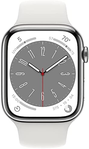 Apple Watch Series 8 (GPS + Cellular, 45MM) Silver Stainless Steel Case with White Sport Band (Renewed)
