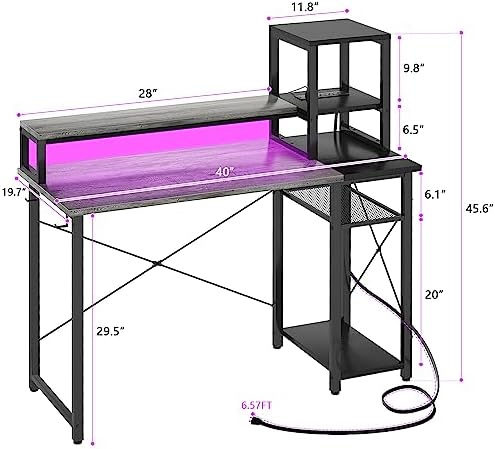 Color: Grey and Black, Desk Size: 40’’ (Length) * 19.7’’(Width)* 29.5’’(Height), Monitor Shelf Size: 28’’ (Length), the Total Height of the Desk with Shelves:45.6”, Length of Charging Cable: 6.57FT (2M), Charging Station Type: 3 charging outlets + 2 USB ports. Weight Capacity: 250 lbs.