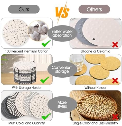 Package including: These drink coasters set includes 10 pieces of round hand-woven cotton coasters in 5 styles and a metal holder. The simple design and classic colors of these coasters go well with any table decor and perfect integrate into any home decor style, like kitchen, bedroom, or every corner in your home.
