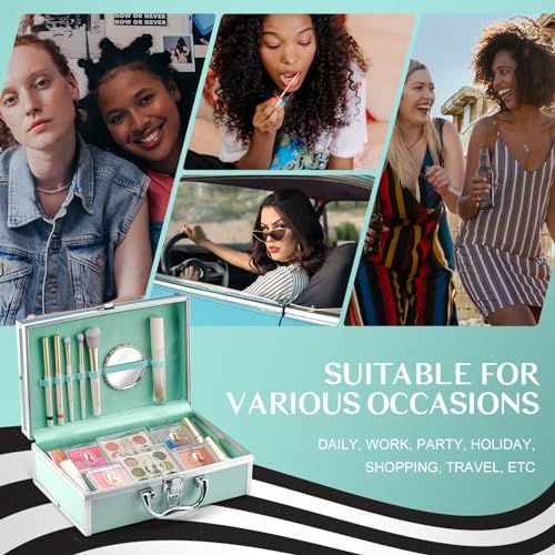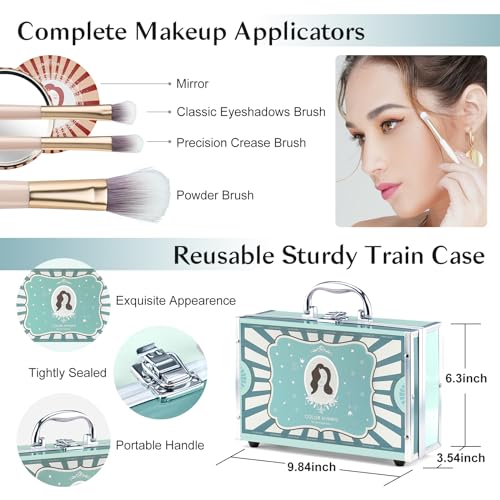 Color Nymph Girls Makeup Kits For Teens With Green Retro Train Case Included Portable Matte Shimmer Glitter Eyeshadow Palettes,Lipstick,Lip Oils,Blushes,Highlighter,Brushes,Mirror