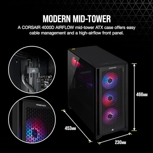 Step up your game with a CORSAIR VENGEANCE i7500 Series Gaming PC, powered by a 14th Gen Intel Core processor, NVIDIA GeForce RTX 40-Series graphics, and CORSAIR VENGEANCE RGB DDR5 memory. Dynamic RGB lighting brilliantly illuminates the system, with powerful CORSAIR iCUE software to control lighting, fan and pump speeds, and more. The VENGEANCE i7500 Series is cooled by an H100i RGB ELITE liquid CPU cooler and six SP RGB ELITE fans with AirGuide technology for concentrated airflow. Equipped with a high-speed M.2 NVMe SSD, housed in a roomy CORSAIR 4000D AIRFLOW mid-tower case, and easily upgradeable thanks to a standard ATX form-factor, this is everything you need to game with a VENGEANCE.