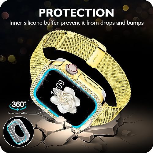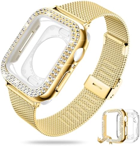 DABAOZA Compatible Bling Apple Watch Band for Women with Bumper, Glitter Case Cover Girls Stainless Steel Mesh Loop Strap Metal for iWatch Series 9 8 7 6 5 4 3 2 1 SE Ultra 2/1