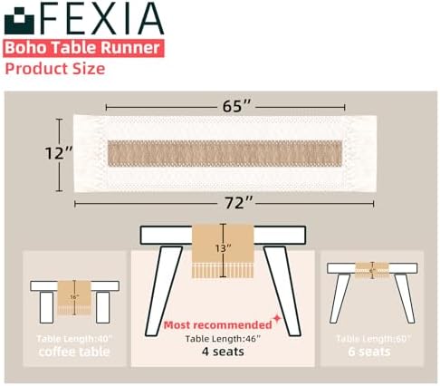 [Perfect 72 Inches Long] Our macrame table runner with tassels measures 12 x 72inch, fits a dining table that seats 4-8 people. It can give your tables a rustic and boho look. (Because it is folded in the bag, when you take it out, the table runner will have creases, which will affect your measurement. So, please make sure the table runner is placed neatly and flat before measuring)