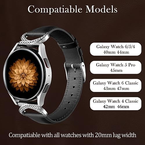 Genuine Leather Slim Watch Band Compatible with Samsung Galaxy Watch 6 5 4 40mm 44mm for Women, Galaxy 5 Pro 45mm Bands, Classic 6 4 Wristband 47mm 43mm 46mm 42mm, 20mm Band with Bling Diamond
