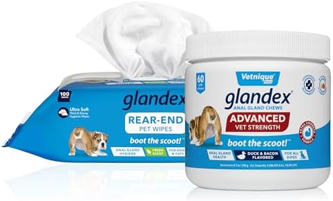Glandex Anal Gland Hygienic Pet Wipes 100 Ct and Glandex Advanced Vet-Strength Chews 60 Ct Bundle Dog Cleaning Wipes with Fresh Scent, Vet-Strength Anal Gland Supplement for Dogs with Extra Fiber