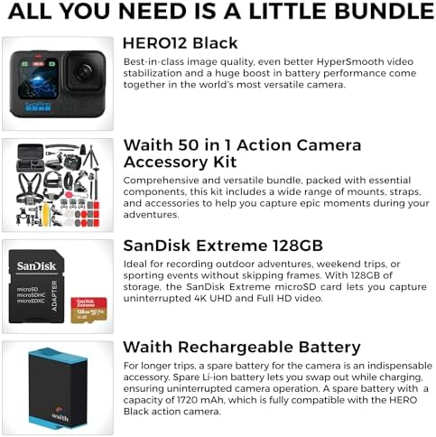 What’s Included: GoPro HERO12 Camera (Black), Waith 50 in 1 Action Camera Accessory Kit, Memory Card 128GB and Waith Rechargeable Battery (Black)