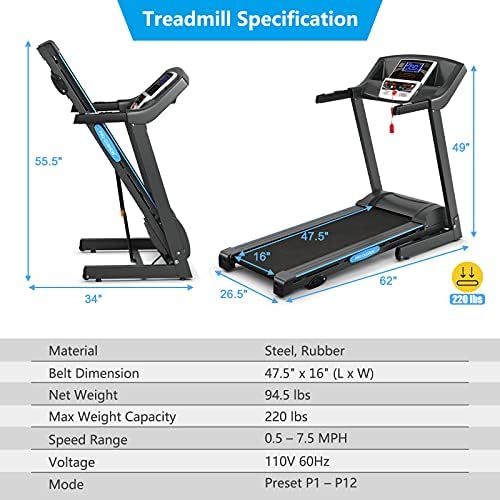 【Compact Home Treadmill】Folding Design and compact size of the running machine makes it perfect for your home/office. Heavy duty frame ensures great load-bearing capacity of 220 lbs and long service life.