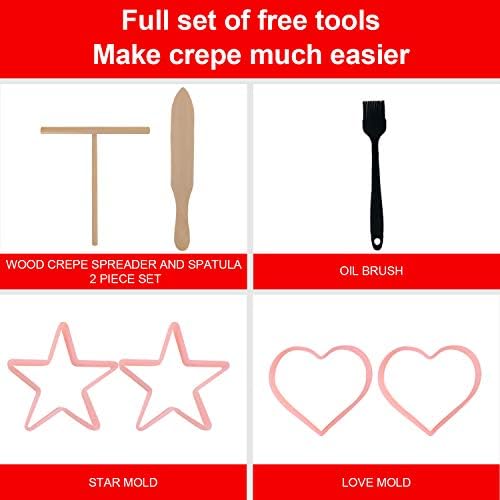 Free tools: wood crepe spreader and spatula, oil brush and spoon, star mold*2, love mold*2, recipes and crepe making tips included, making crepe easier, more convenient and more interesting.