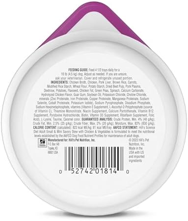 Mealtime has never been easier – or more delicious – for your little dog! Just peel back the top of Hill’s new single serve trays for a delicious way to provide precisely balanced nutrition that enhances the overall health and well-being of your pet. Hill’s Science Diet Adult Small & Toy savory stews use high-quality lean proteins to help maintain ideal body conditions and gentle fibers to promote healthy digestion. Expertly developed by Hill’s nutritionists and veterinarians, Science Diet dog food is a tasty, healthy choice for your dog. Hill’s 100% Satisfaction : We’re confident your pet will enjoy Hill’s Science Diet foods. We’re so confident that we offer a 100% money-back . If you are unsatisfied for any reason, return the unused portion to for a full refund or replacement. For more information on returning an purchased product, visit the returns center.