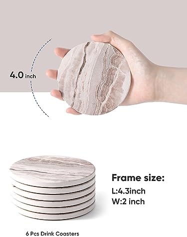 Beautiful Decoration – Neutral color will match many decors, the natural sandstone appearance. Upper layer of coasters is absorbent ceramic stoneware with transfer pattern print, so these coasters are also great to decorate your kitchen, living room, bedroom or office