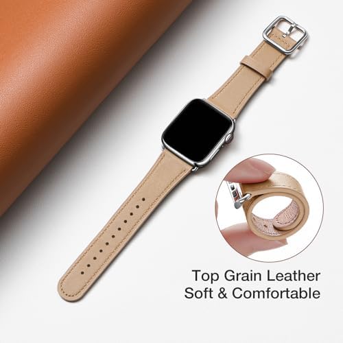 MNBVCXZ Compatible with Apple Watch Band 38mm 40mm 41mm 42mm 44mm 45mm 49mm Women Men Girls Boys Genuine Leather Replacement Strap for iWatch Series 9 8 7 6 5 4 3 2 1 Ultra SE (Camel/Silver)
