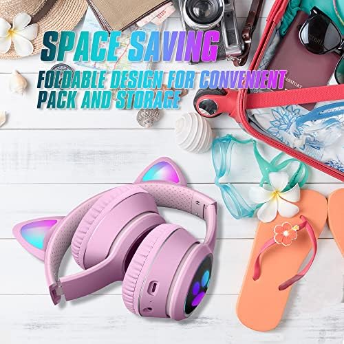 Mokata Gaming Bluetooth 5.0 Wireless Headphones Over Ear Cat LED Light Foldable Music Headset with AUX 3.5mm Microphone (Built-in) for Adult & Kids PC TV Game Music Pad Laptop Cellphone Pink