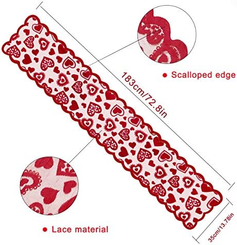 Soft and Safe Material: This Valentines day table runner made of premium lace, bright and vivid red color,knitted with various heart pattern, exquisite scalloped edges, not easily loose thread, soft and lightweight. our table runners can be applied to various table surfaces, such as dinner table, desk, storage table, coffee table and so on, suitable for indoor or outdoor picnic activities, can add a classic and elegant touch to the table.