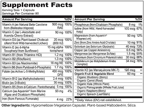 Premium Plant-Based Ingredients: Our Whole Food Multivitamins are made with plant-based vitamins and minerals including Vitamin D3 from lichen, Vitamin E from Sunflower, and Calcium and Magnesium from marine algae.