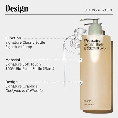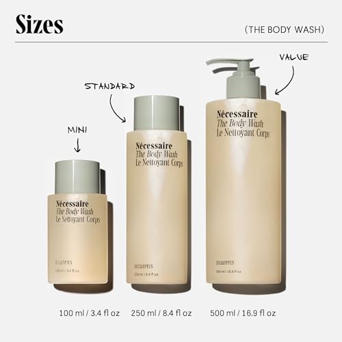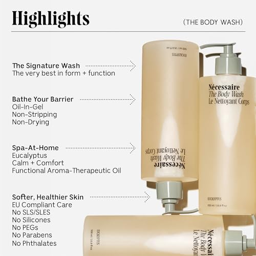 Nécessaire The Body Wash Eucalyptus with Pump. Oil-in-gel Cleanser. Cacay + Marula Oil, Vitamin A/C/E + Omega 6/9 and Nicacinamide. Dermatologist-Tested. Hypoallergenic. 500ml / 16.9 fl oz
