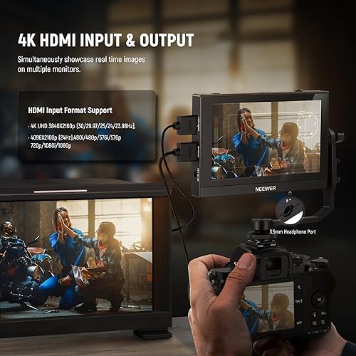 【4K HDMI Loop In & Out】 Enjoy real time monitoring without compromising the video quality, and share live screen across larger monitors or projectors without delay, ideal for directors, photographers and other “visual captains”. Support HDMI input of 4K UHD 3840X2160p (30/29.97/25/24/23.98Hz), 4096X2160p (24Hz), and 480i/480p/576i/576p/720p/1080i /1080p. Also support simultaneous audio monitoring via a 3.5mm headphone jack (headphone not included)