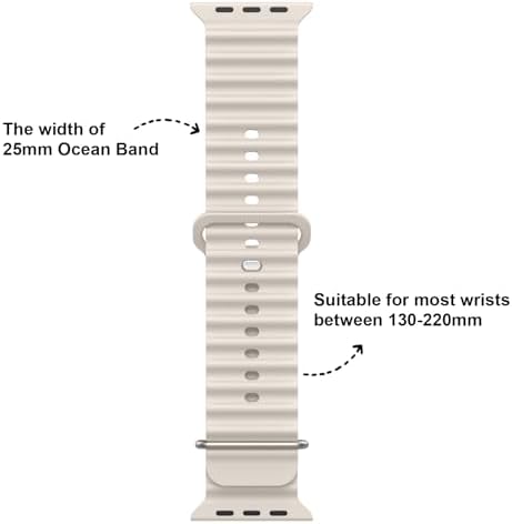 Introducing our Ocean Silicone Bands Compatible with Apple Watch Ultra. Designed specifically for the Apple Watch Ultra 49mm, 45mm, 44mm, and 42mm, these soft silicone sport wristbands are the perfect replacement strap for your iWatch Ultra 2, Ultra, and SE Series 9, 8, 7, 6, 5, 4, 3, 2, and 1. Whether you are a woman or a man, these bands are suitable for everyone. Made from high-quality silicone, our Apple Watch Ultra Ocean Bands offer a comfortable and durable wearing experience. The soft and smooth texture of the silicone ensures that the band feels gentle against your skin, preventing any irritation or discomfort, even during extended wear. The material is also sweat-resistant, making it ideal for sports and fitness activities. One of the key features of our Apple Watch Ultra Ocean Bands is their compatibility with the Apple Watch Ultra. These bands are specifically designed to fit the Ultra 49mm and 45mm models, providing a perfect and secure fit. The width of the band is 25mm, which adds to its stylish and modern look. The band is also adjustable, fitting most wrists between 130-220mm, ensuring a comfortable fit for a wide range of users.