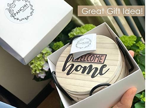 RELAX AND ENJOY: ABSORBENT COASTERS, NO SCRATCH. PANCHH coasters for drinks are made of sand stone and cork. Sandstone is an absorbent material that can absorb moisture and liquid condensation quickly. This moisture absorbing material will absorb liquids quickly, keeping your surfaces clean and dry of drips from bottled drinks or cups. The cork on the backside provides a non-scratch surface that is safe to use on any type of tabletops and counters. Each cup coaster has a unique home scripture or phrase that will evoke feelings of calmness, relaxation, security, peace, and happiness. These coaster messages will remind you to slow down, unwind, and enjoy the moment! STORAGE HOLDER INCLUDED! This beautifully design farmhouse coasters set of 6 includes 6 assorted designed coasters and 1 black metal holder. The holder is great for storing the coasters so they don’t get lost or misplaced. It also keeps your coffee table or counters looking organized, neat, and tidy. GIFT FOR ANYONE AND ANY OCCASION Whether you are looking for a kitchen gift or home gift for a family member, friends, or clients, they will be so happy to receive these cute and absorbent farmhouse coasters! This set of rustic coasters with holder makes a great present for so many exciting occasions such as: housewarming party or new home party, hostess party, realtor gifts for clients, birthday gifts for women, holiday gifts, home décor gifts, first home gifts. PRODUCT DETAILS – Coaster Size: 4 in x 4 in. Coaster Thickness: 0.25 in. Coaster Colors: 2 white coasters, 2 brown coasters, and 2 blue & brown coasters. Coaster Holder: Black metal. Shape: Round Coasters
