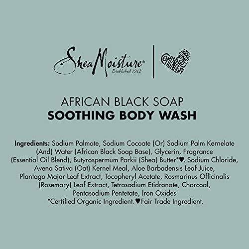 SheaMoisture’s African Black Soap Soothing Body Wash gently cleanses blemished prone skin. This black soap paraben free body wash is blended with Fair Trade Shea Butter, African Black Soap, Oats and Aloe. This balancing wash, blended with African Black Soap, Oats, Aloe, and Fair Trade Shea Butter is a gentle skin cleanser and helps hydrate. African black soap is a time-honored beauty secret, and we’ve created our black soap body wash formula made from natural ingredients. Apply this body wash cleanser to a washcloth or hands to cleanse entire body. We are sustainably produced goodness. Skin care made with love for you and your body. SheaMoisture is pioneering fair trade through Community Commerce at home and abroad. This body wash is formulated with no parabens, no phthalates, no mineral oil and no sulfates. It’s been tested on our family for generations and never on animals. OUR STORY: SheaMoisture is the legacy of Sofi Tucker, a pioneering mother of four and an entrepreneur, who sold Shea Butter, African Black Soap and homemade beauty preparations in Sierra Leone in 1912. We honor her vision by continuing to formulate with Raw Shea Butter handcrafted by women in Africa. With every purchase you show support of our mission to reinvest back in our communities.