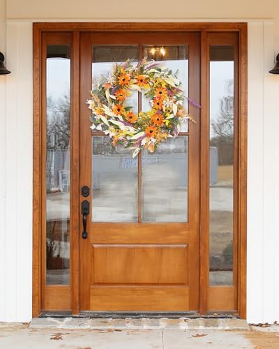 Spring Wreath for Front Door 22 inch, Artificial Spring Summer Door Wreaths with Hook Lavender Wild Flower Wreath Orange Daisy Eucalyptus Leaves All Year Wreath Farmhouse Indoors Outside Home Décor