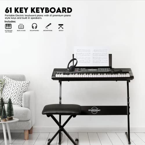 Starument 61 Key Premium Electric Keyboard Piano for Beginners with Stand, Built-in Dual Speakers, Microphone, Headphone, Bench & Display Panel