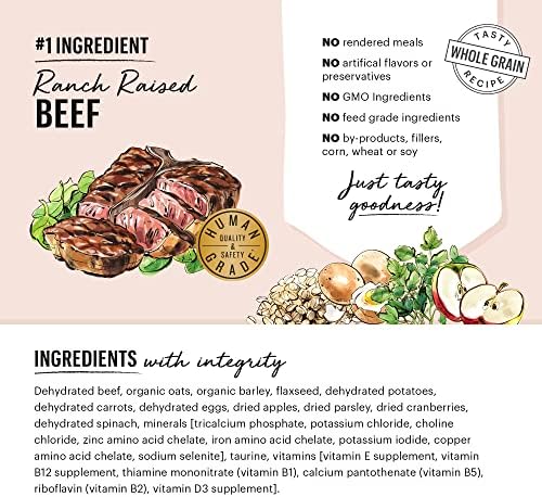 RANCH RAISED BEEF & ORGANIC WHOLE GRAINS: The Honest Kitchen Whole Grain Beef dog food is made with real whole food ingredients like ranch raised beef, organic oats & apples, which are gently dehydrated for maximum nutrient retention & digestion.