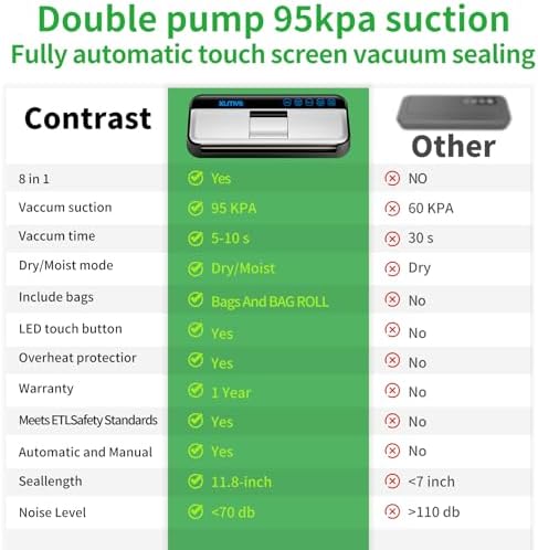【Multifunctional automatic food vacuum sealing machine】: Sealing width 5mm-7mm and 95KPA large suction automatic vacuum sealer suitable for dry/wet/oil/powder various foods,Can be used for slow cooking,8-in-1 function,seal/dry/moist/enhanced moist vac seal/manual vac/external vacuum, select function button, the LED indicator will prompt you to start or end.The spot pump mode is suitable for fragile foods,strengthen moist seal please wait 2 minutes after each use to avoid excessive temperature.