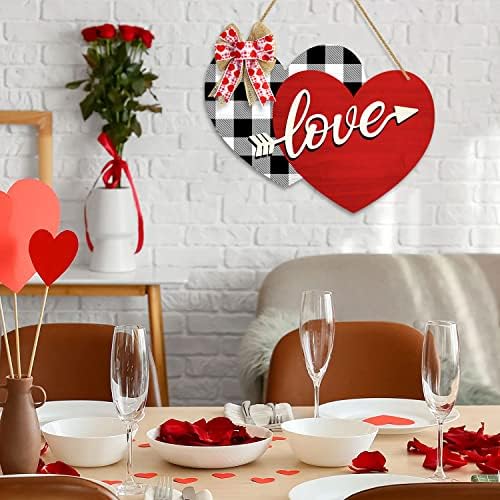 Valentines Day Door Sign, Red Heart Wooden Sign Love Wall Hanging, Happy Valentines Day Decor for Front Door, White and Black Buffalo Check Plaid with Ribbon Bow Rustic Farmhouse Home Decorations