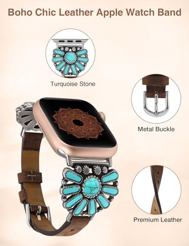 W-RARA Leather Band Compatible with Apple Watch Band Women 38/40/41/42/44/45/49mm, Boho Western Vintage Turquoise Ethnic Antique Style Strap for iWatch Series Ultra 2 SE 9 8 7 6 5 4 3 2 1