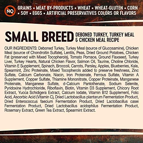 GRAIN-FREE SMALL BREED ADULT DRY DOG FOOD: Protein packed, nutrient dense kibble combined with 100% raw freeze-dried turkey pieces for a crave worthy savory dog food; with optimal protein levels, high fiber and calorie content your dog needs to thrive.