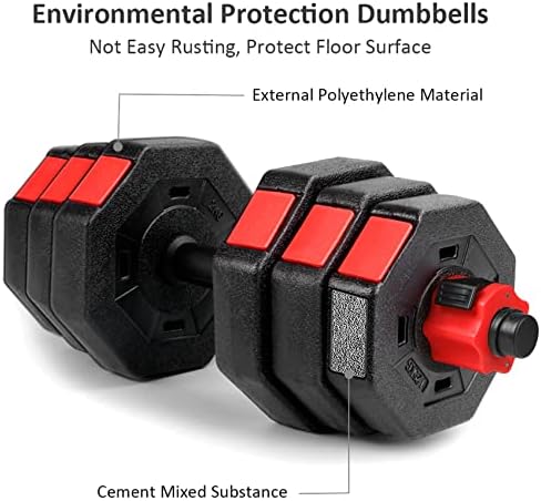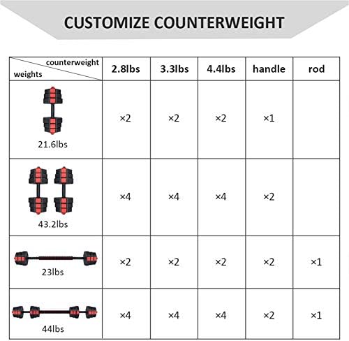 【Adjustable Weight】- With dumbbells available in smaller size,totally up to 44 lbs, you’re free to customize the weight setting to meet the training needs.Made of cement mixed substance and polyethylene, the fitness dumbbells kit provides you with various weight options, ranging from 12.8lbs to 44lbs. Key Product Features